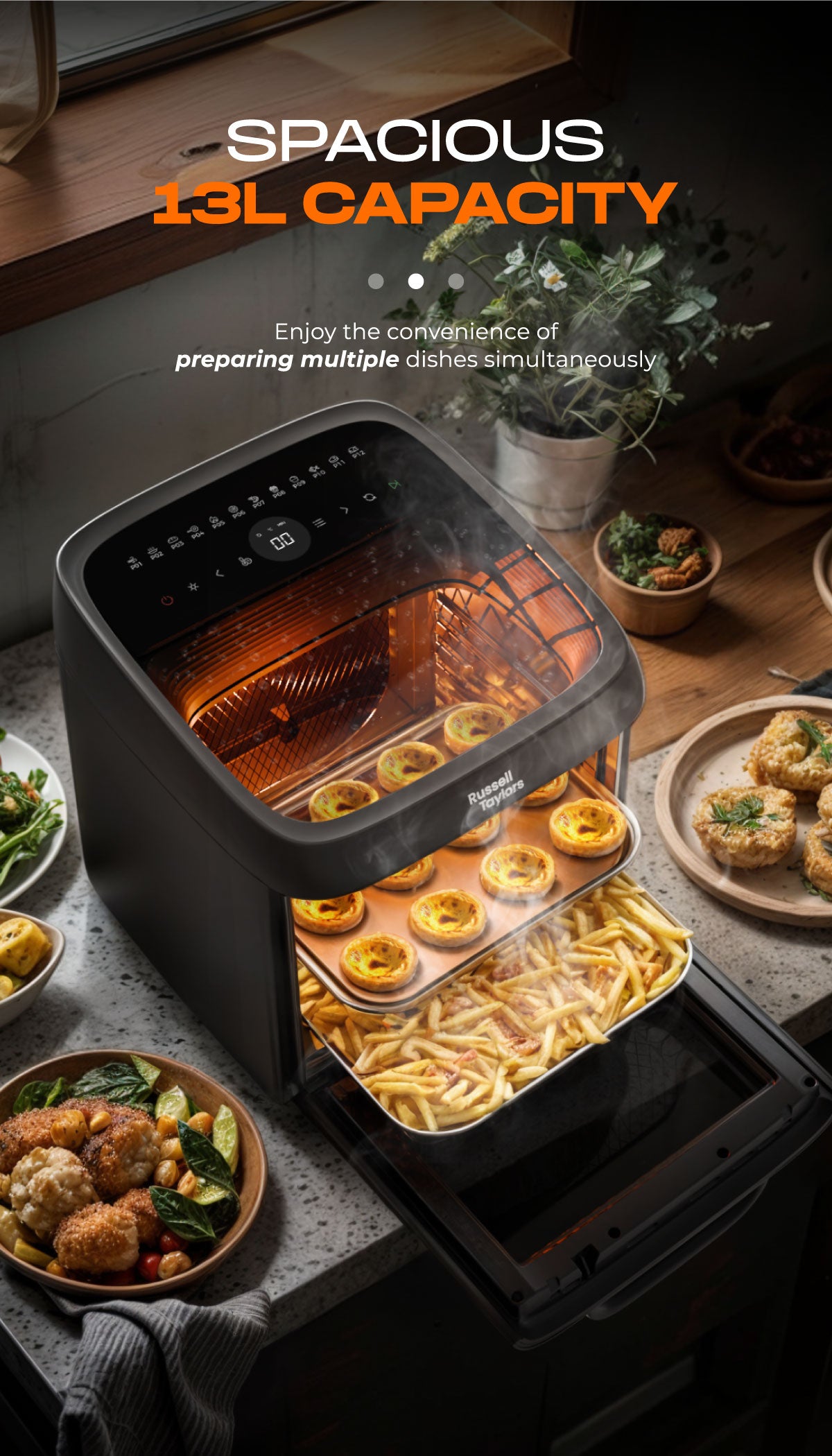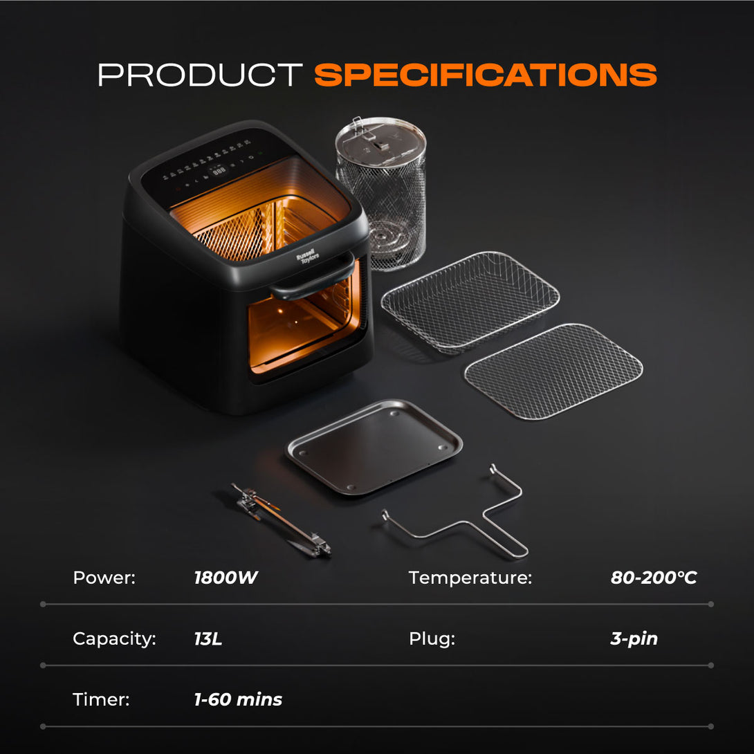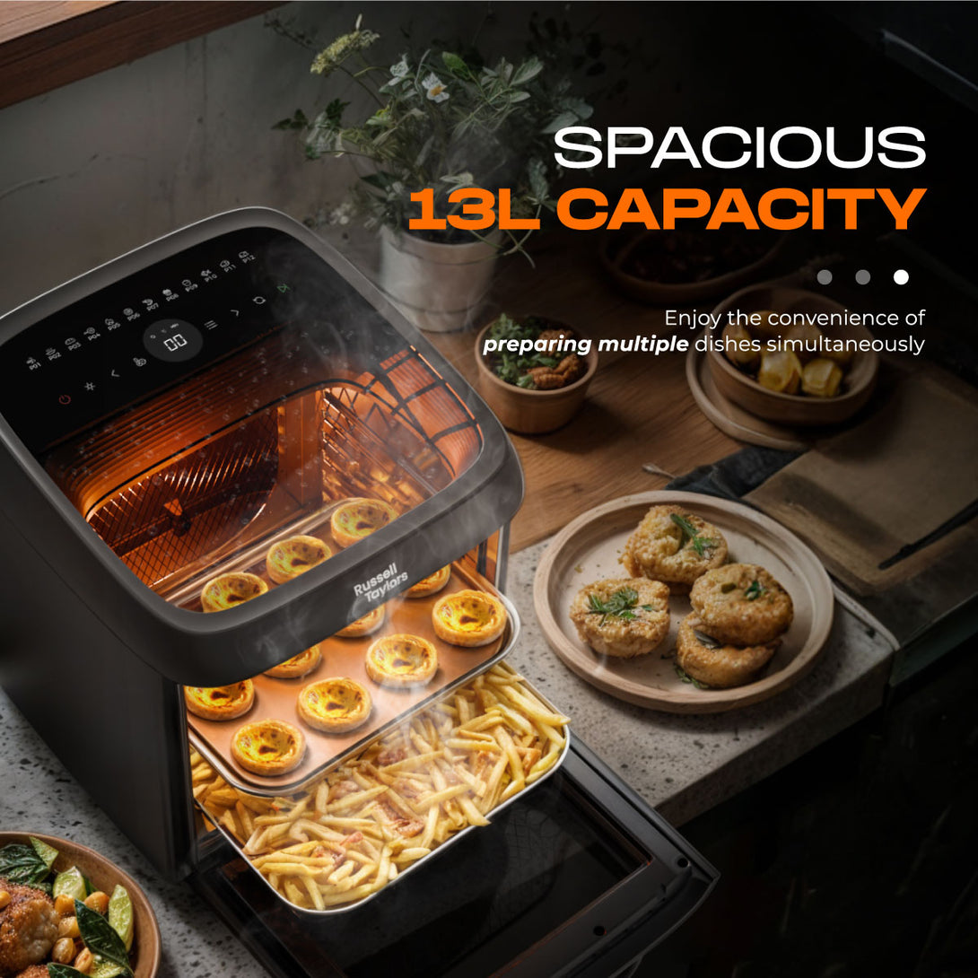 - Spacious 13L Capacity - Cook for the whole family or host a feast with ease. It fits whole chickens, pizzas, or large portions and is perfect for preparing multiple dishes at once.