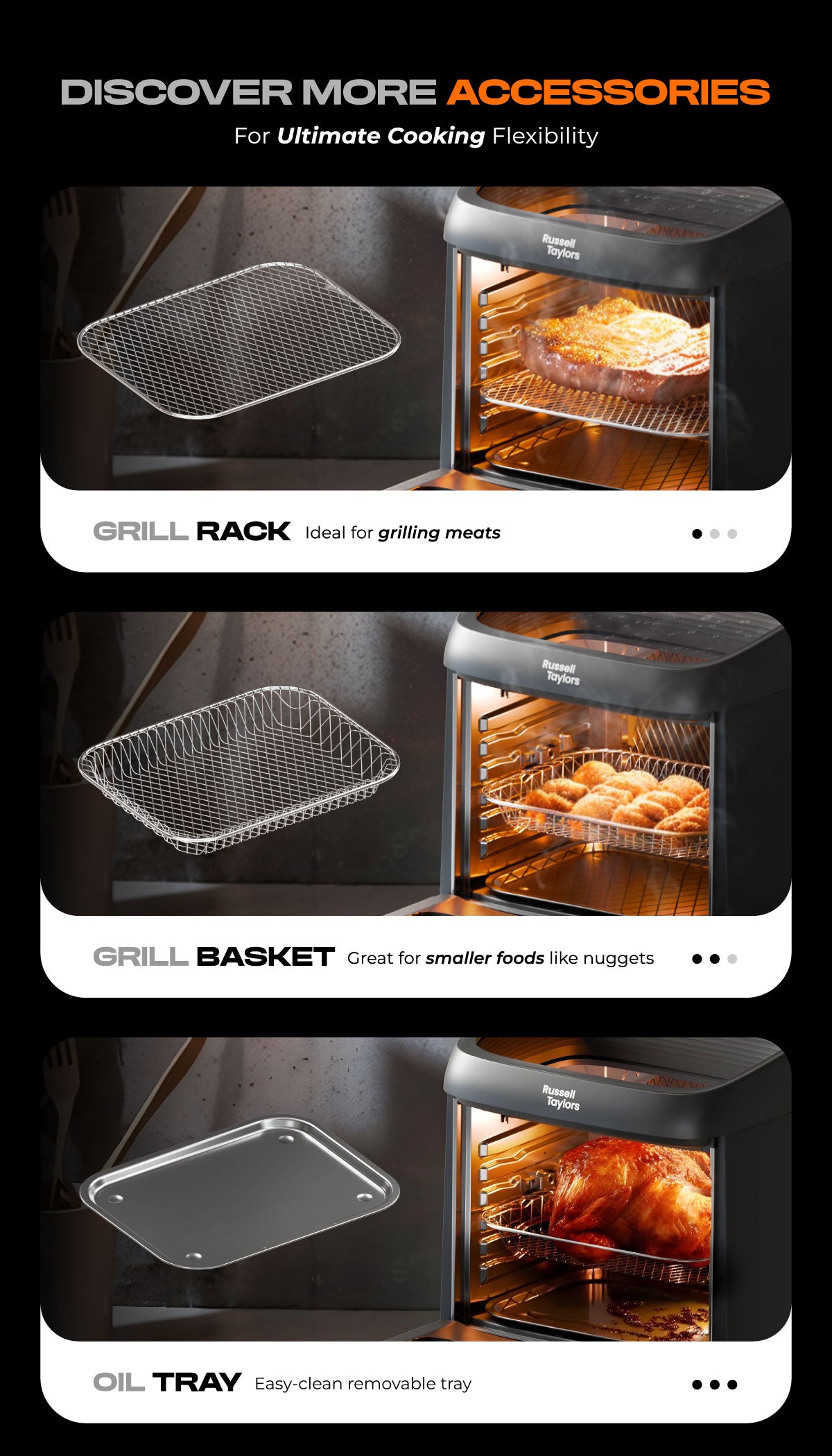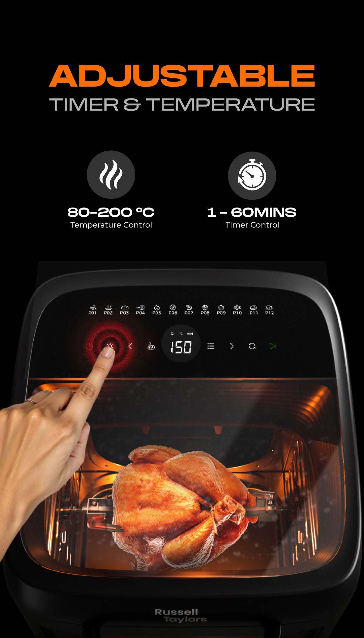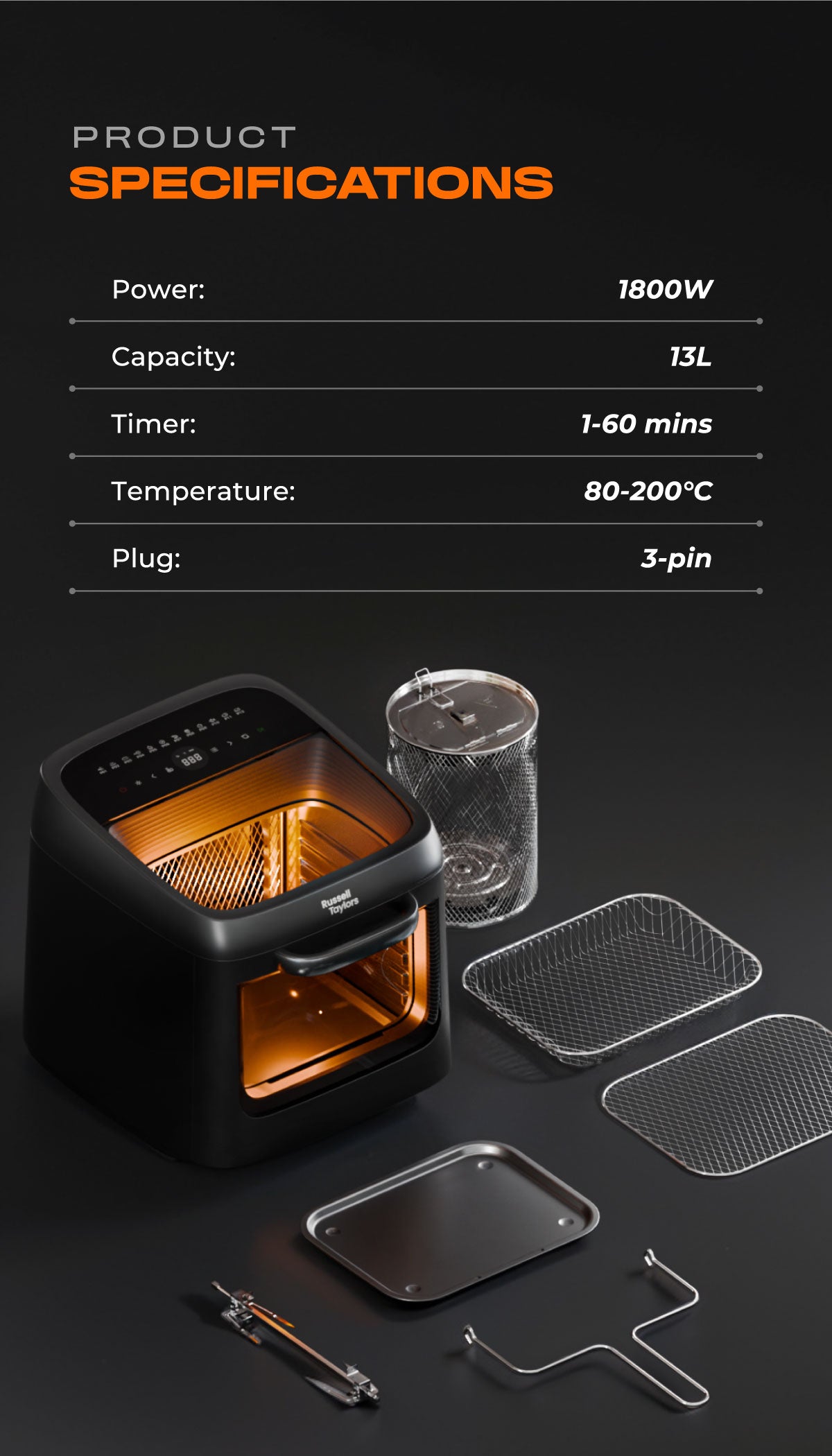 - Spacious 13L Capacity - Cook for the whole family or host a feast with ease. It fits whole chickens, pizzas, or large portions and is perfect for preparing multiple dishes at once.