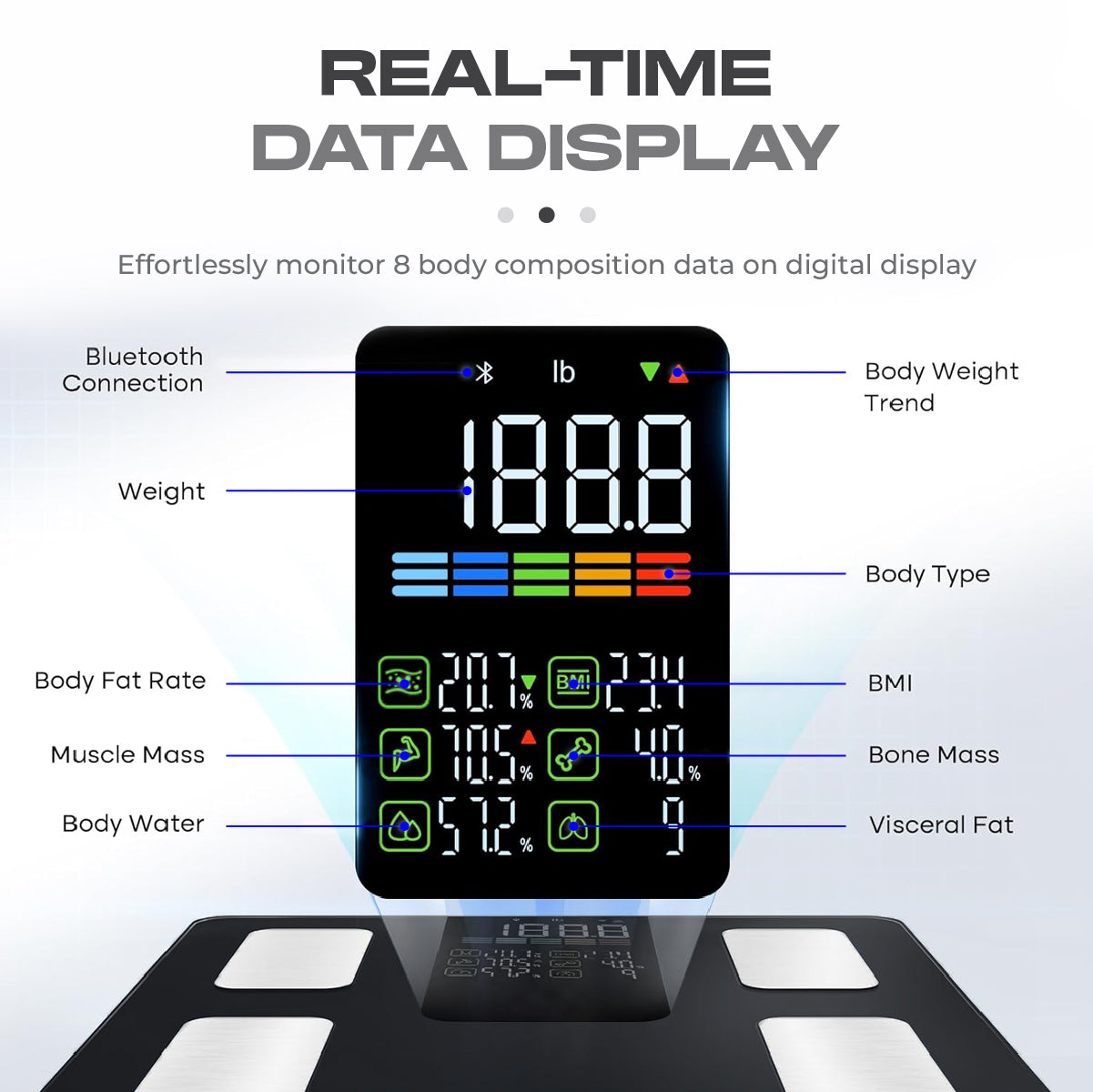 - A large VA Display Screen that measures 8 key metrics to help you get a clear view of your essential body measurements.
