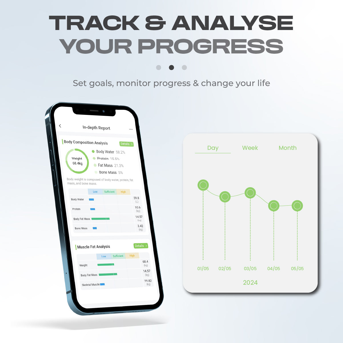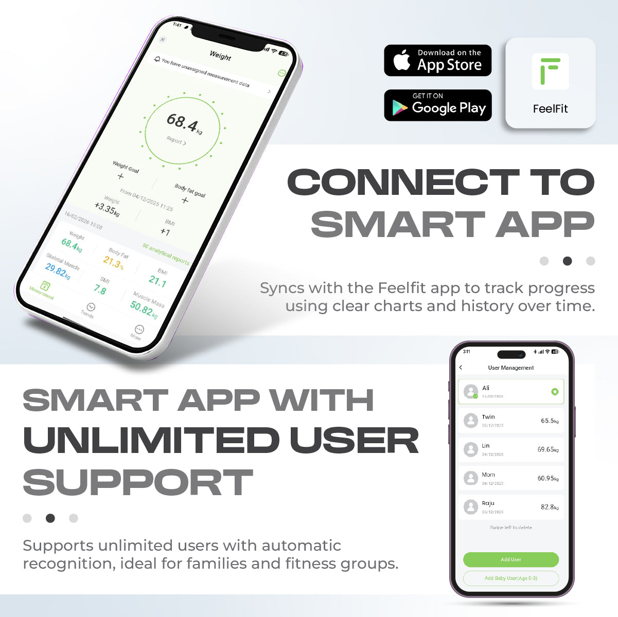 - Download the “FeelFit” app to sync your smart scale to your phone and view detailed charts and trends over days, weeks and months!