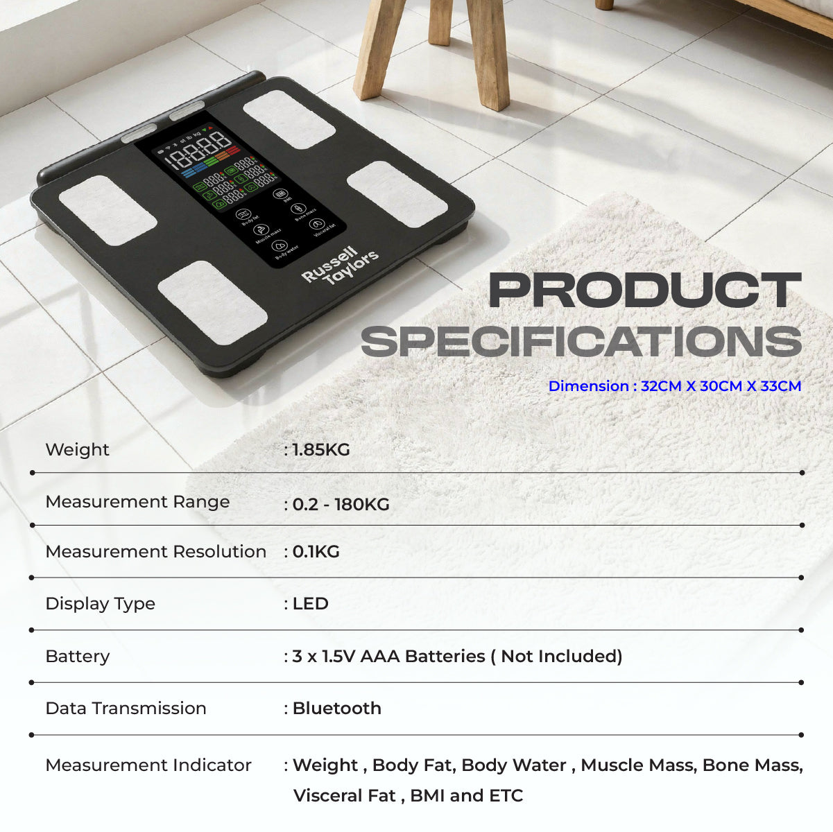Russell Taylors Bluetooth Body Composition Penimbang Komposisi Badan Body Fat Weighing Scale BWS-30