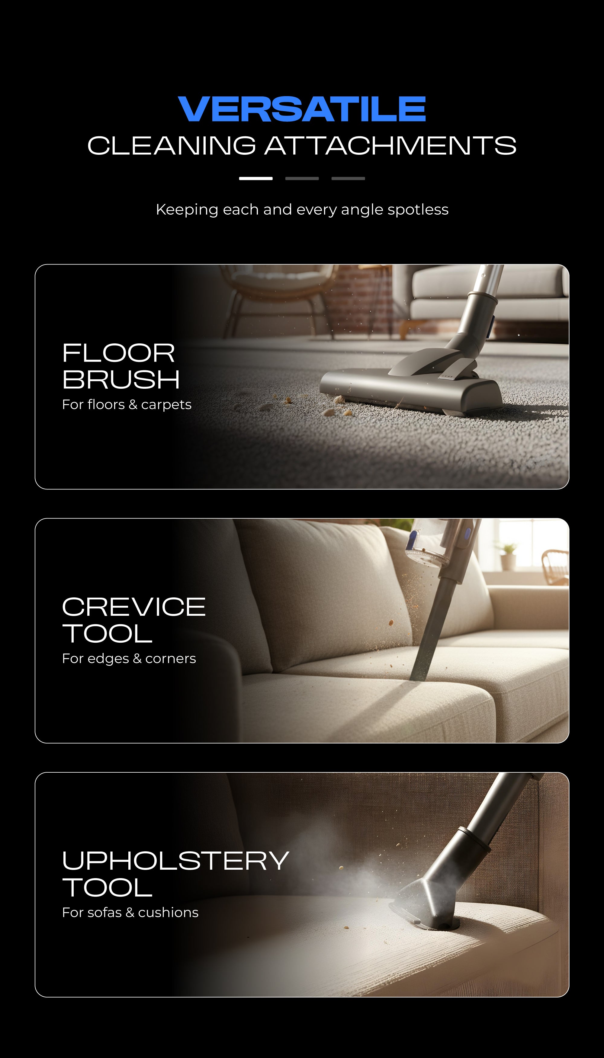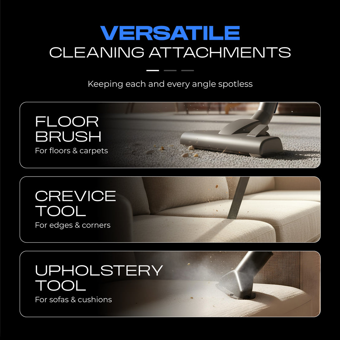 - Versatile Attachments – Comes with a crevice tool and upholstery tool to clean corners, sofas, and cushions with precision. Perfect for every surface in your home.