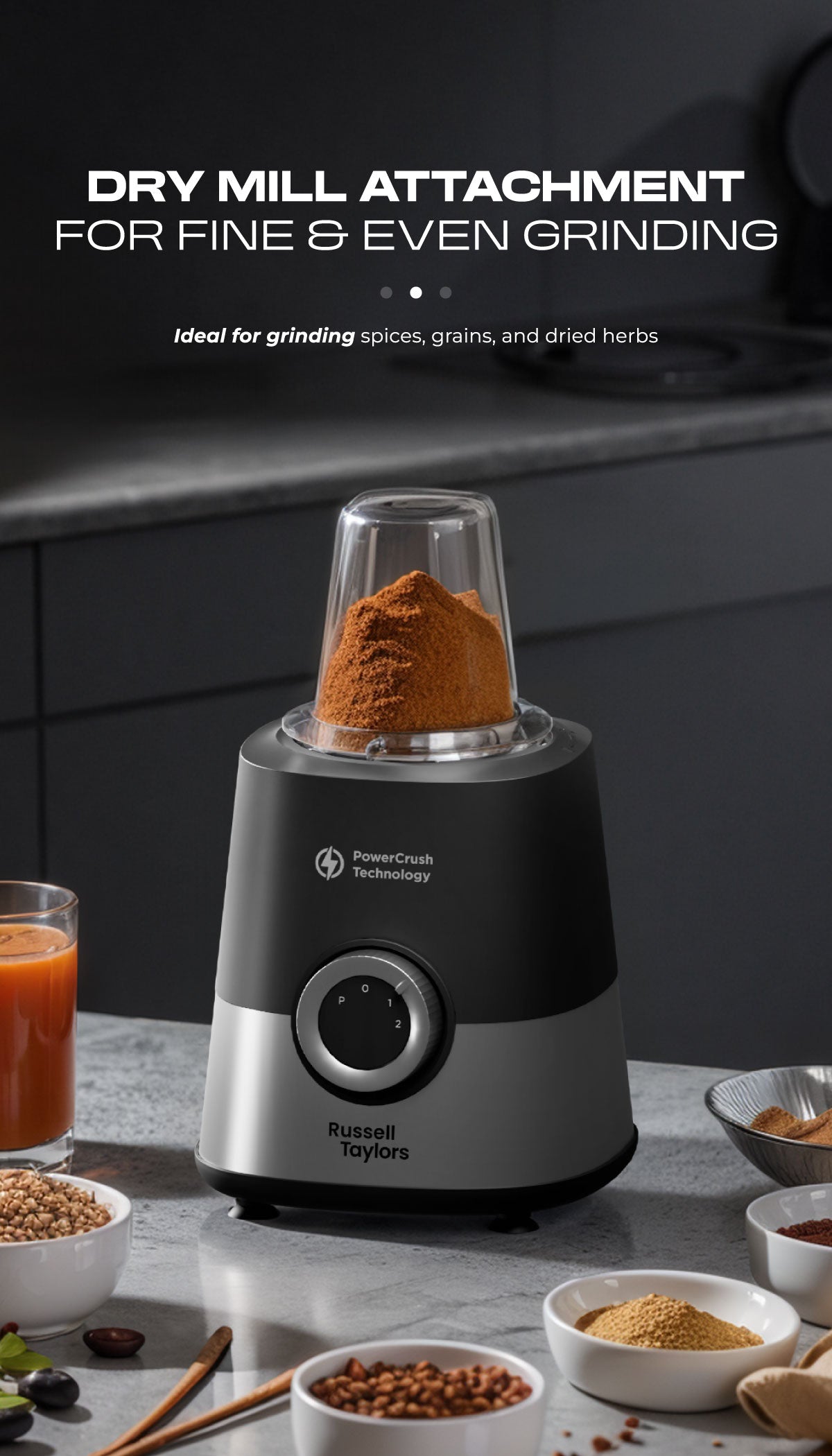 - Comes with a compact dry mill grinder, perfect for spices, coffee beans, and grains. You can easily switch between blending and grinding with one versatile appliance.