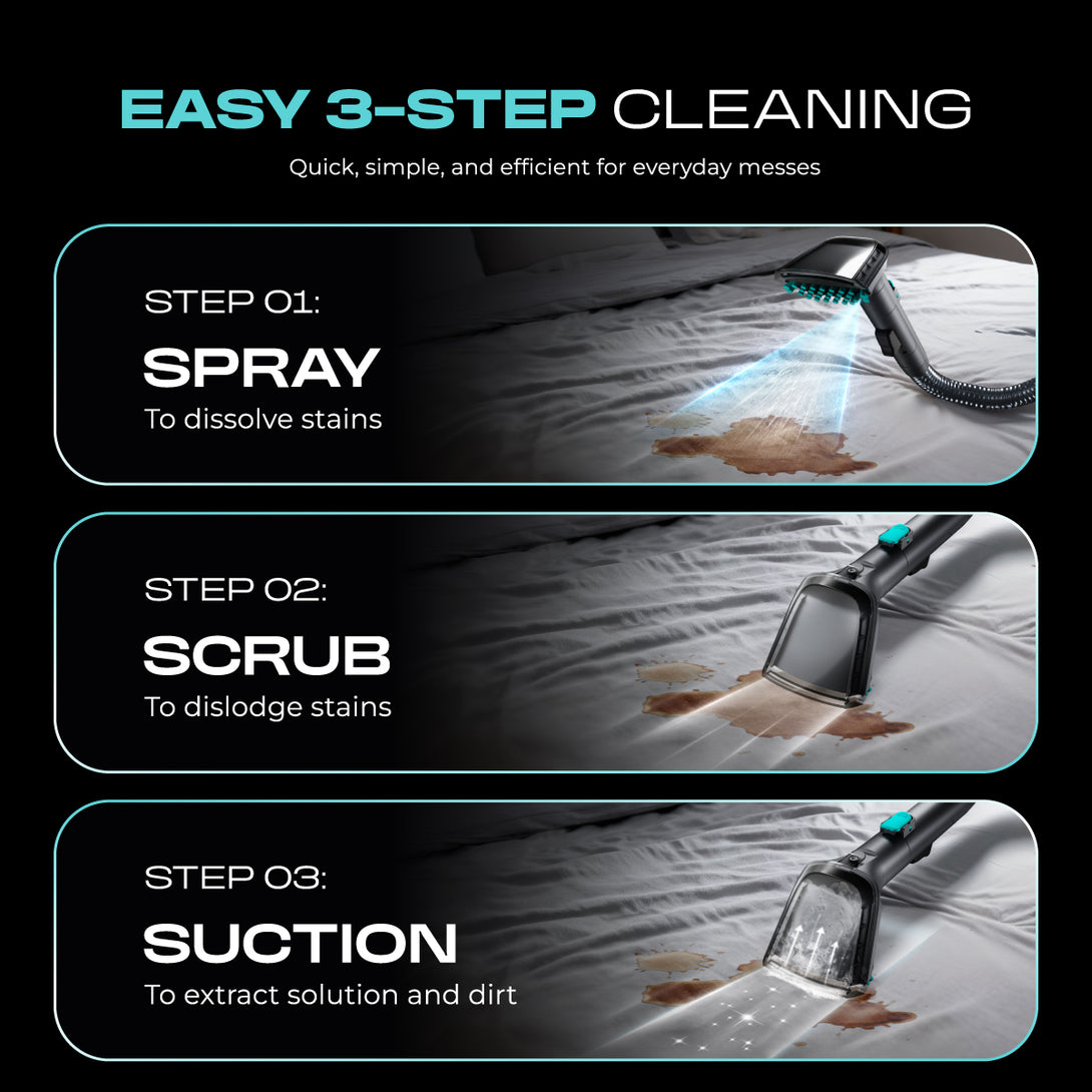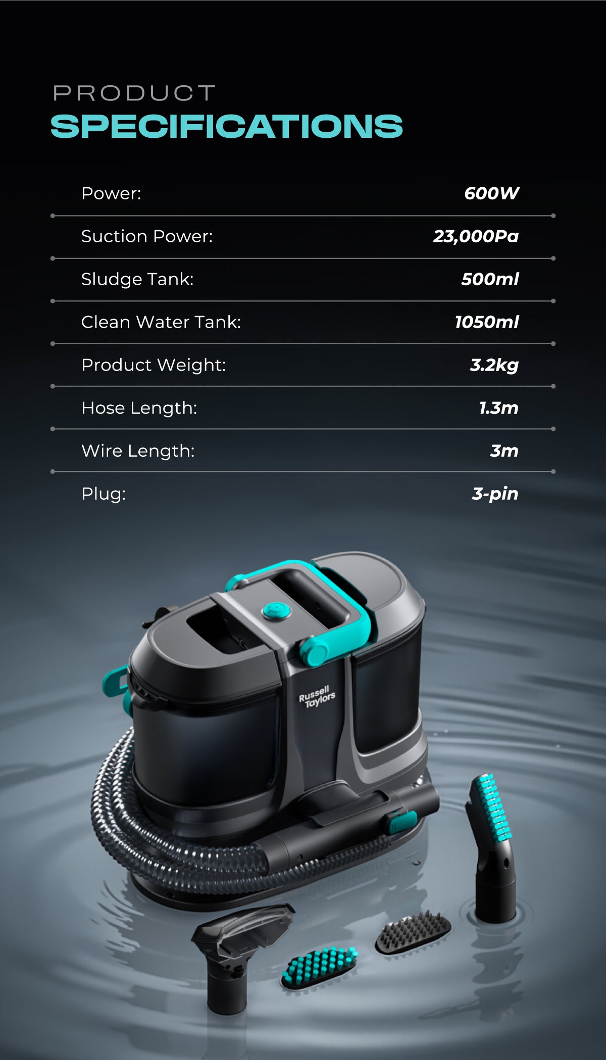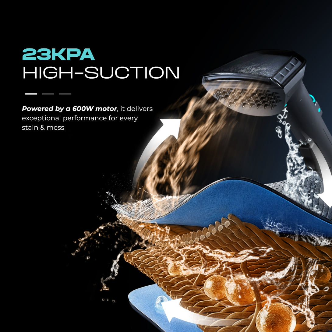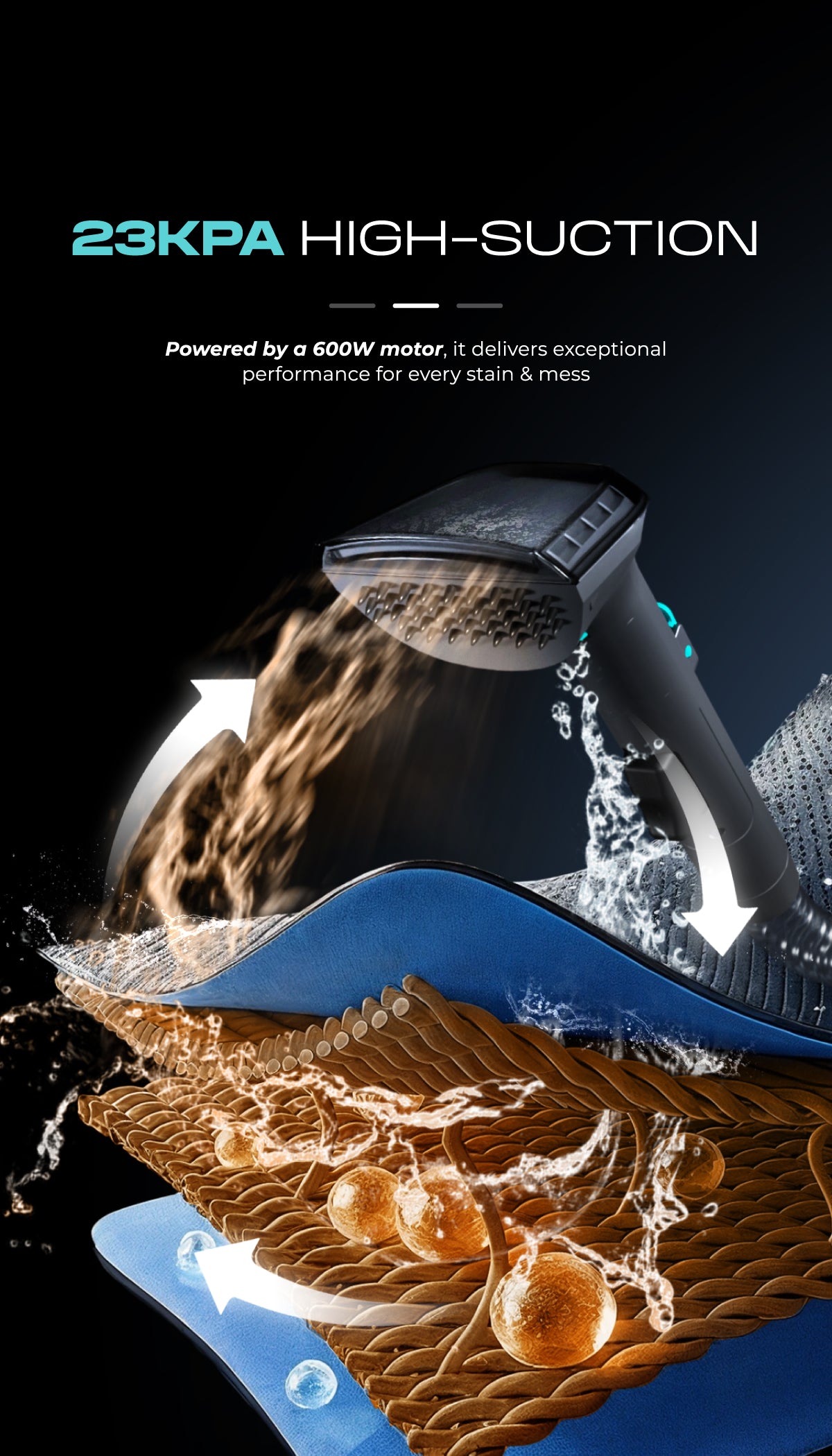 - Powerful 600W Motor with 23KPA Suction – Removes tough stains and deep dirt from carpets, upholstery, car seats, and more.