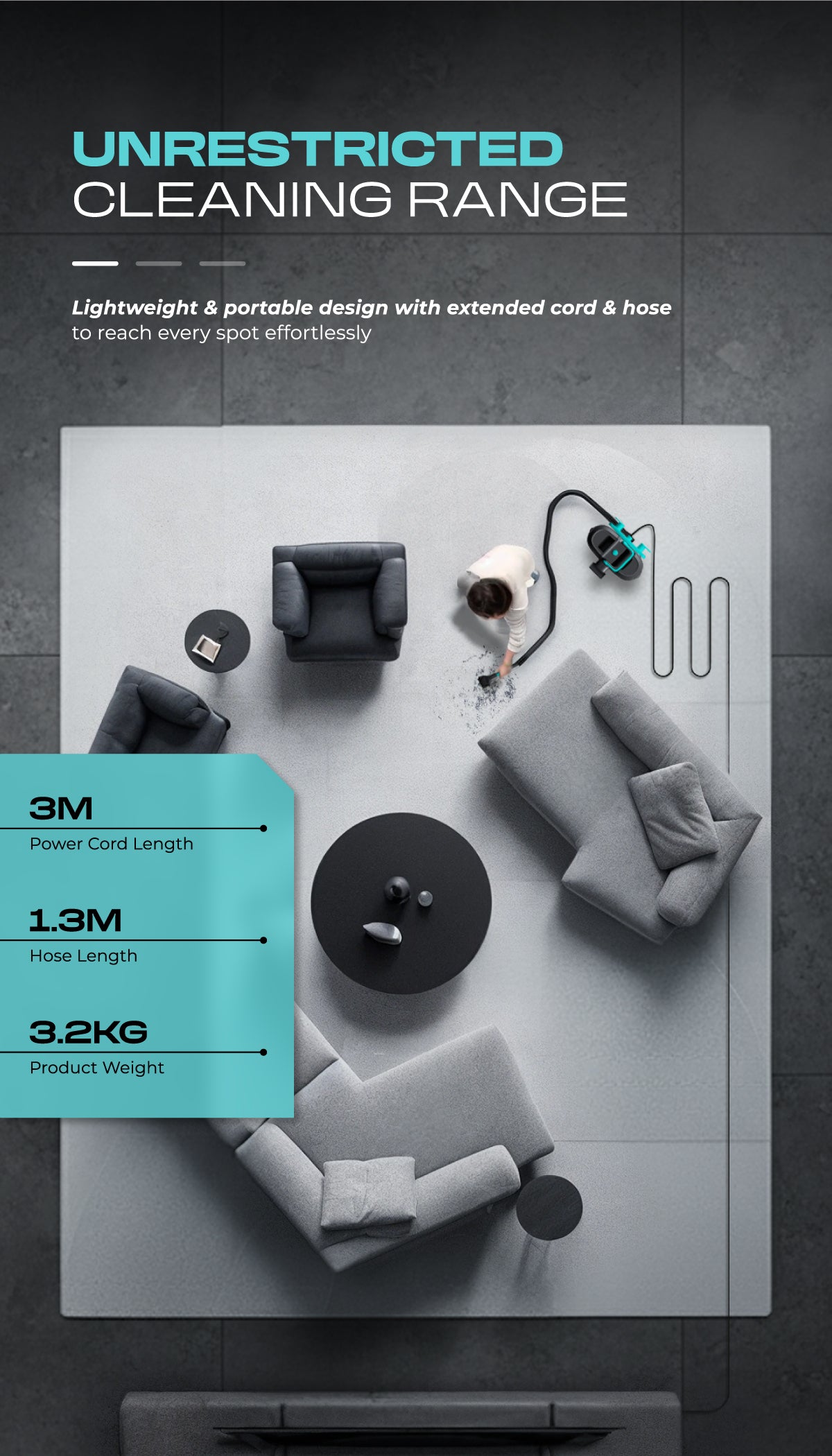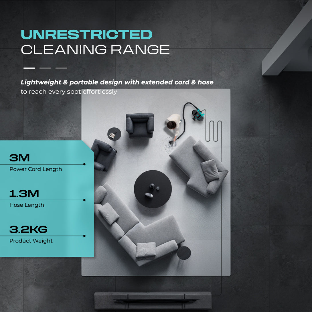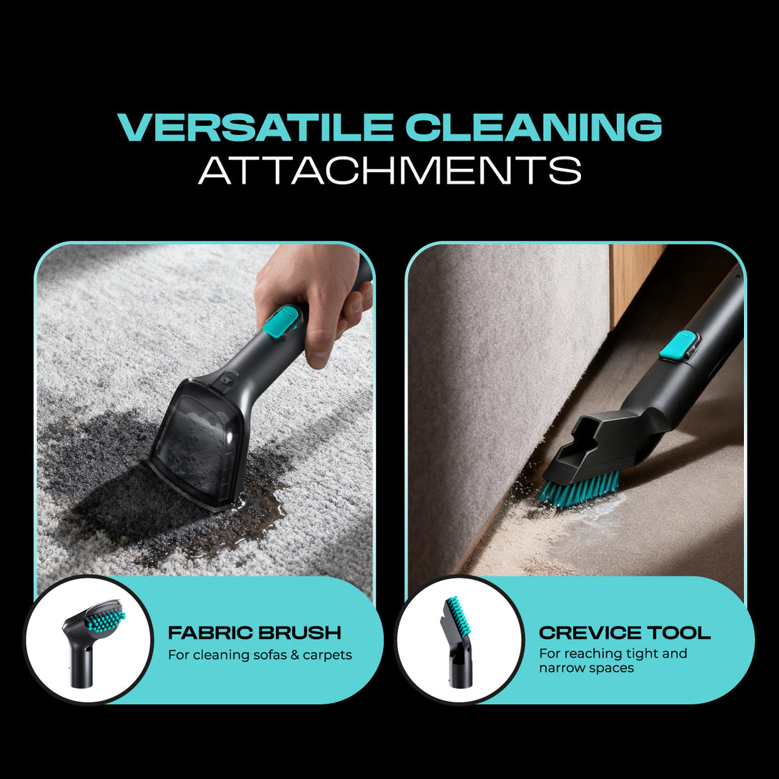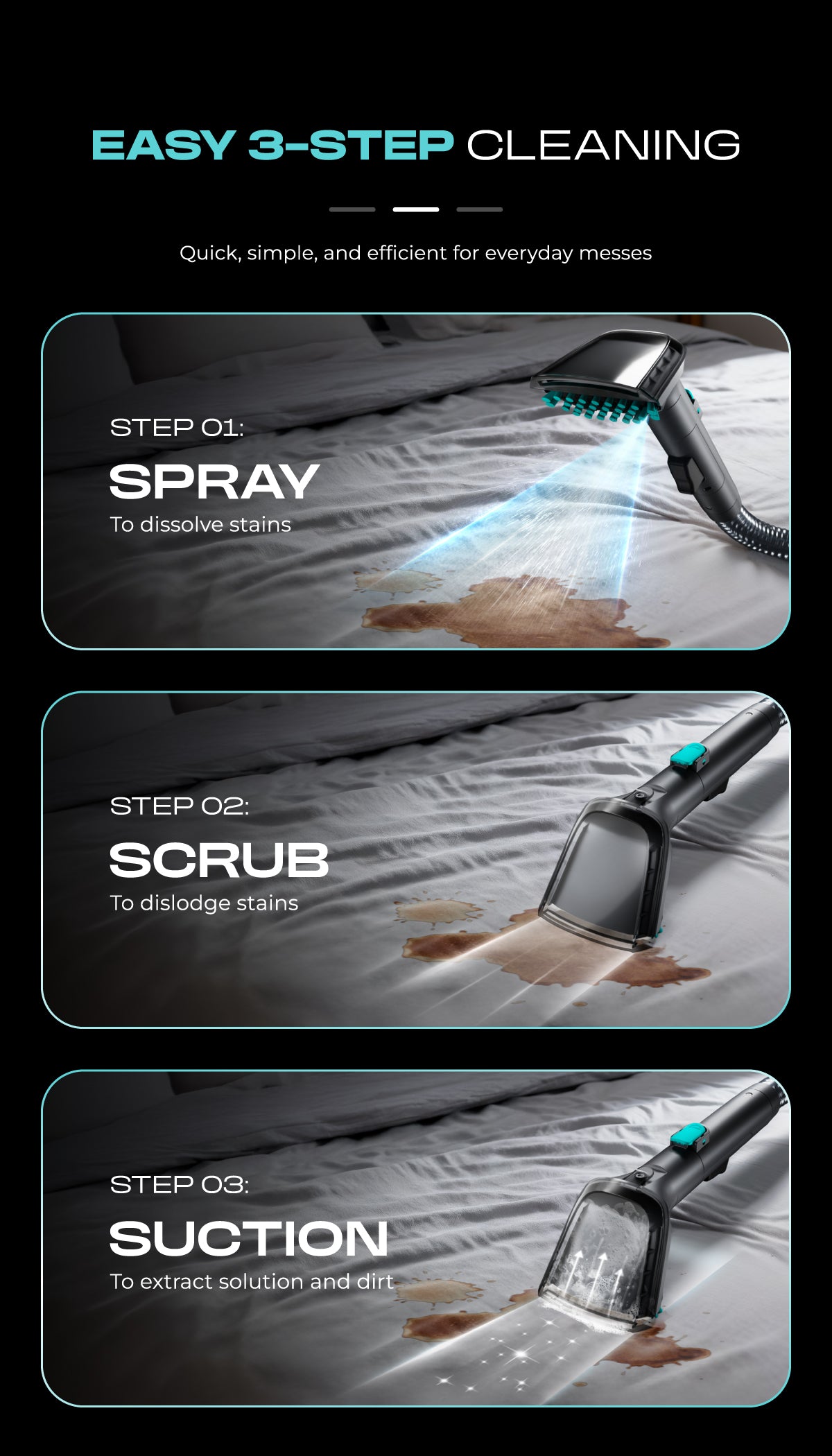 - Powerful 600W Motor with 23KPA Suction – Removes tough stains and deep dirt from carpets, upholstery, car seats, and more.