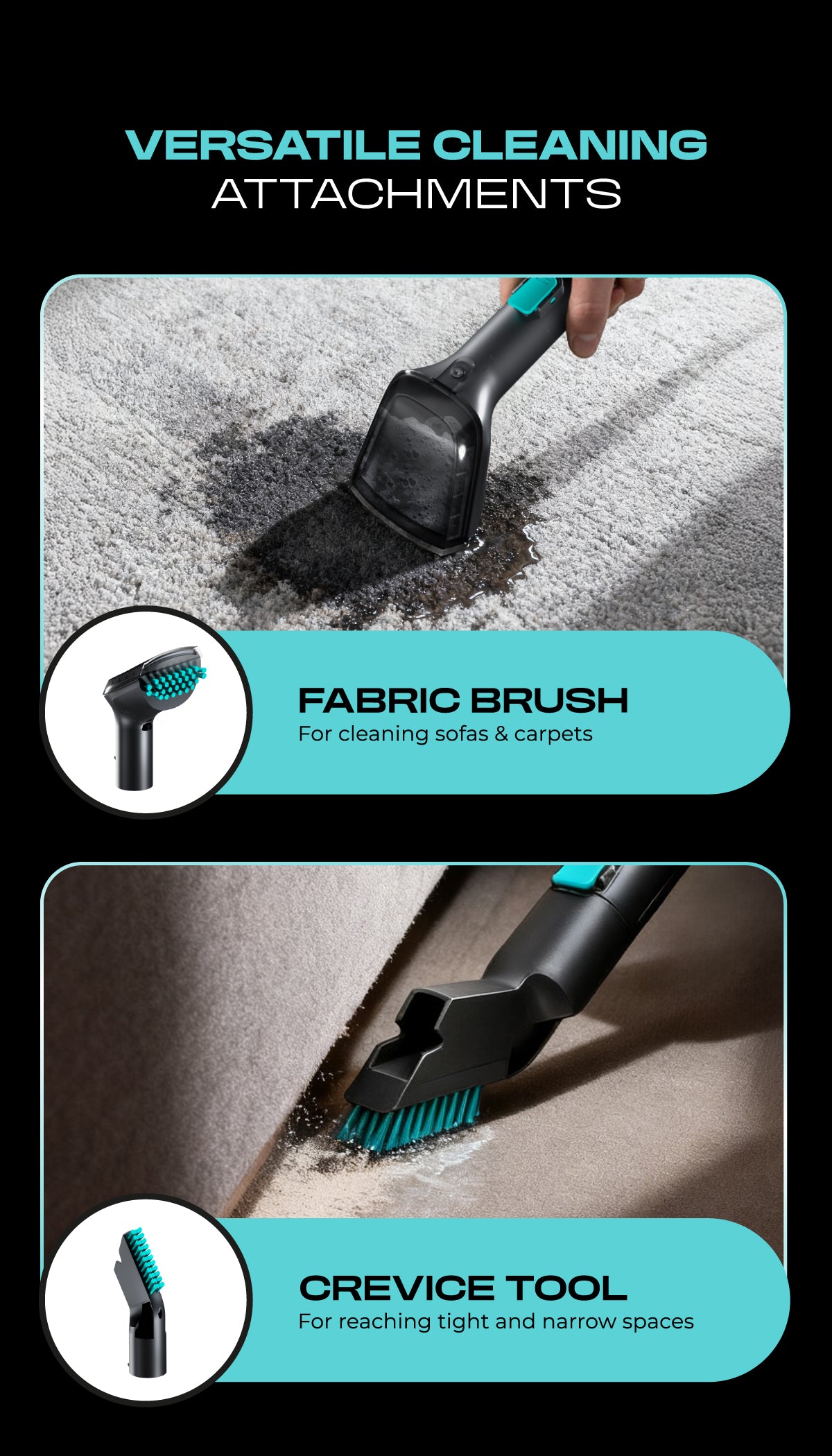 - Multiple Attachments – Includes a spot cleaner brush and crevice tool for stains, spills, and tight spaces.