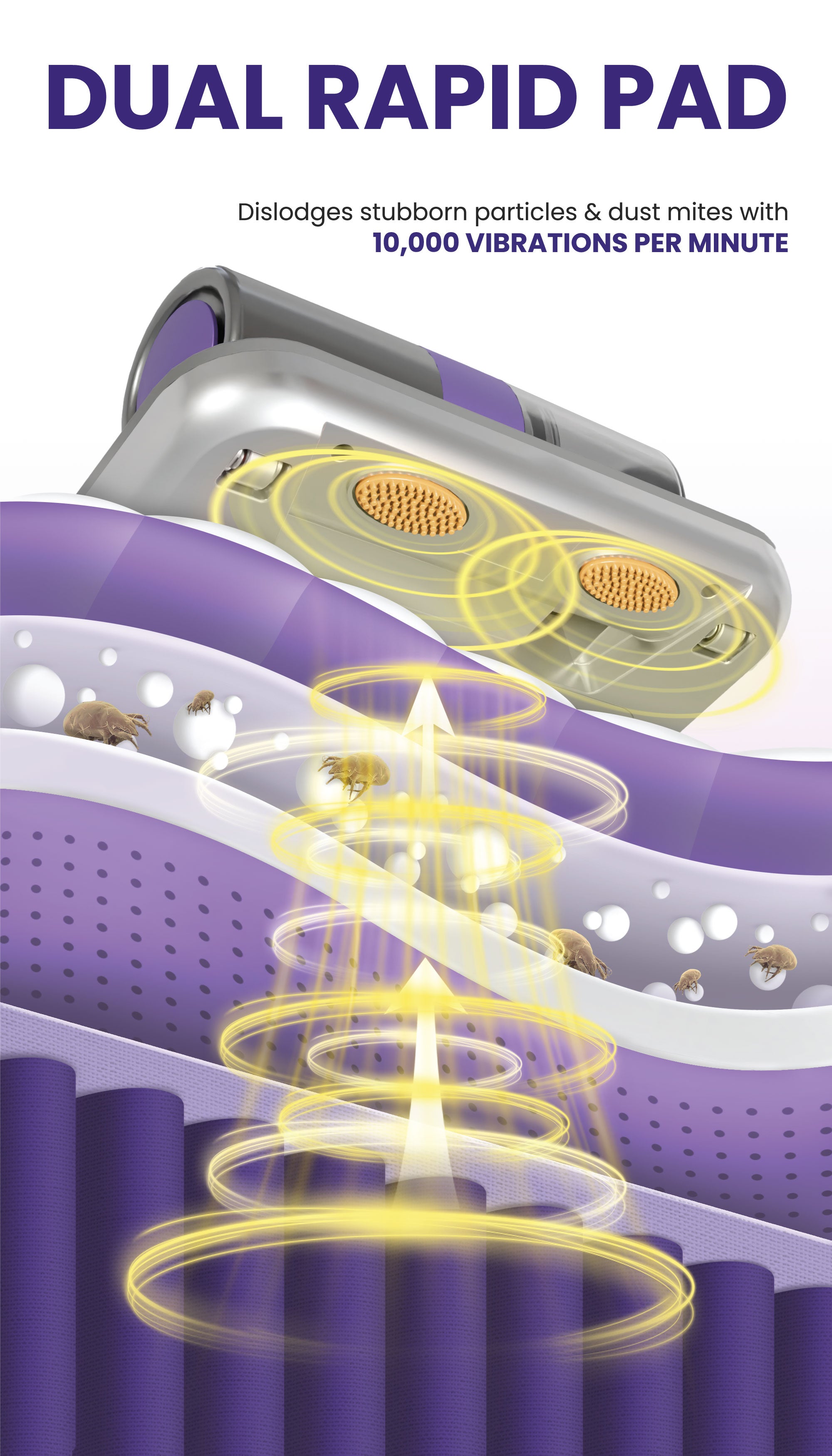 - DUAL RAPID PAD - Pulsating pads vibrate 10,000 times per minute to agitate and loosen household dust, dirt and dust mite matter. This makes places like your mattress, bedding, furniture, upholstery and even clothing imposible for dust mites to hide.